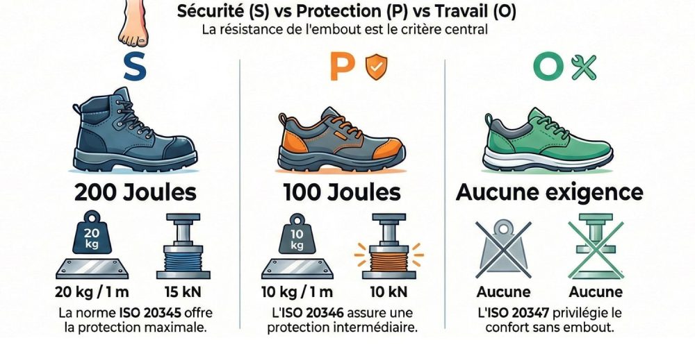 Au-delà de l’embout de protection, les chaussures répondent à des niveaux d’exigences (OB, S1, S3, etc.) et à des protections spécifiques.